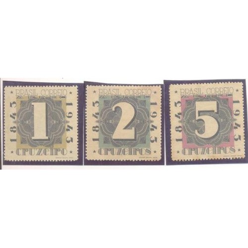Etiquetas: A-048/50 - 1943 - CENTENÁRIO DO SELO POSTAL BRASILEIRO BRAPEX II - 2ª COLUNA - GOMADOS - CHARNEIRA - RHM R$ 72, 00 (14, 40 UFs X R$ 5, 00)