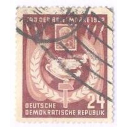 Etiquetas: ALEMANHA DDR - 1952 - USADO - DIA DO SELO - COMPOSIÇÃO COM POMBO CORREIO E OUTROS ELEMENTOS - YT-0075