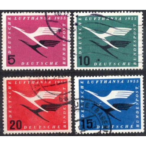 Etiquetas: Alemanha Federal - Reabertura da Lufthansa - MI 205/208 - Y 81/84 (1955) REABERTURA DA COMPANHIA AÉREA LUFTHANSA-SÉRIE 4 SELOS USADOS