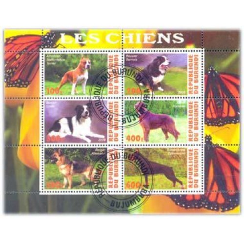 BURUNDI - RAÇAS DE CACHORROS - CLIIE, DOBERMANN. PASTOR ALEM~, ETC - SERIE 6 SELOS USADOS EMITIDOS EM FOLHINHA