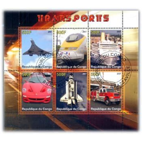 CONGO - ANO 2007 - AVIÃO, CARRO, FOGUETE, NAVIO, ETC - SERIE 6 SELOS USADOS EMITIDOS EM FOLHINHA