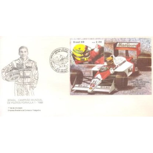 FDC-465 - 1989 - BLOCO CAMPEÃO MUNDIAL DE PILOTOS - FÓRMULA 1 - COM CARIMBO CBC - SENNA AUTOMOBILISMO - RHM R$ 120,00 (24 UFs X R$ 5,00)