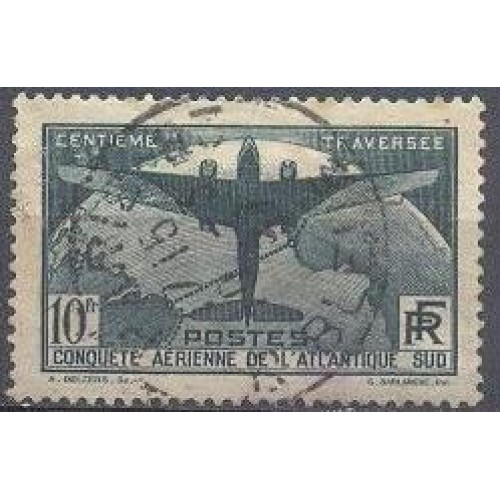 FRANÇA - Y 0321 (1936) 100º TRAVESSIA AÉREA DO ATLÃNTICO SUL 10f VERDE ESCURO AVIÃO SOBRE GLOBO TERRESTRE- USADO, MUITO BONITO