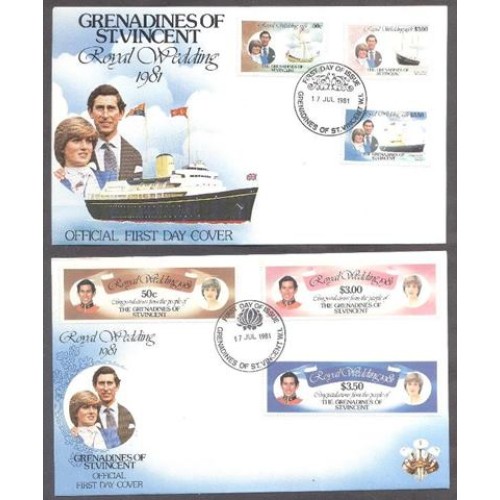 GRENADINES DE SAINT VINCENT - FDC - Y 0210/215 (1981) CASAMENTO REAL DO PRÍNCIPE CHARLES E LADY DIANA- NAVIOS - SÉRIE 6 SELOS SOBRE 2 FDC ILUSTRADOS, UM DELES COM NAVIO