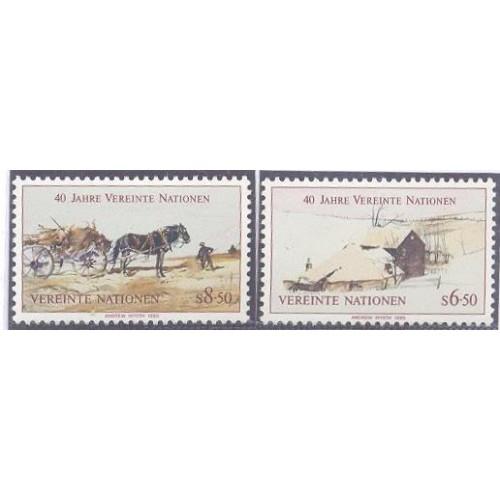 Etiquetas: ONU VIENA - 1985 - MINT - 40º ANIVERSÁRIO DA ORGANIZAÇÃO DAS NAÇÕES UNIDAS: CASA NA NEVE - CAVALO PUXANDO CARROÇA NO CAMPO - SÉRIE 2 SELOS - Y 51/52