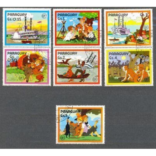 PARAGUAY - Y 2169/75 DO ANO 1985- LITERATURA INFANTO-JUVENIL- ANO INTERNACIONAL DA JUVENTUDE- PERSONAGENS DAS AVENTURAS DE TOM SAWYER DE MARK TWAIN- NAVIOS- BARCOS ETC -SÉRIE 7 SELOS USADOS
