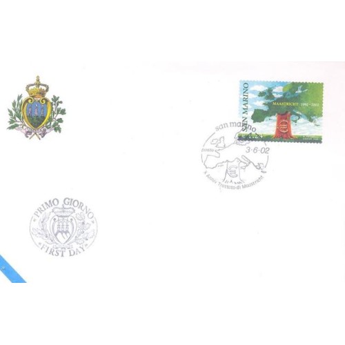 Etiquetas: SAN MARINO - 2002 - FDC - EUROPA - ANEXO - 10º ANIVERSÁRIO DO TRATADO DE MAASTRICHT - COMPOSIÇÃO C/ EUROS, ÁRVORES E MAOA DA EUROPA - LINDO SELO SOBRE FDC OFICIAL COM BRASÃO - Y 1818