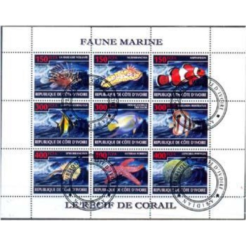 Etiquetas: COSTA DO MARFIM - FAUNA MARINHA 2009 - SÉRIE COM 9 SELOS USADOS EMITIDOS EM FOLHINHA