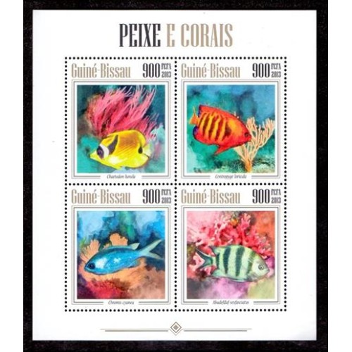 GUINE BISSAU - 2013 - FAUNA MARINHA - PEIXES E CORAIS - LINDO BLOCO COM 4 SELOS!!!