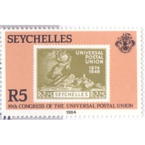 Etiquetas: SEYCHELLES - 1984 - MINT - SELO SOBRE SELO/UPU - 19º CONGRESSO DA UPU EM HAMBURGO - REPRODUÇÃO DO SELO YT-124 - SELO DESTACADO DESTE BLOCO - YT-BL-23