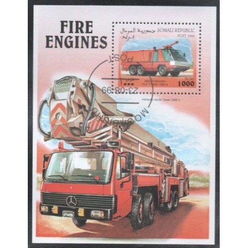 Etiquetas: SOMÁLIA - BLOCO COM 1 SELO - CARIMBADO - TRANSPORTE - CARRO DOS BOMBEIROS - 1999