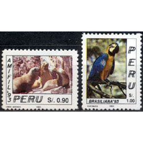 PERU - Y 0997/998 (1993) FAUNA / BRASILIANA : EXPO FILATÉLICA NACIONAL NO PERU E EXPO. INTERNACIONAL BRASILIANA 93, NO RIO DE JANEIRO - FOCAS E PAPAGAIO - SÉRIE 2 SELOS NOVOS SEM GOMA