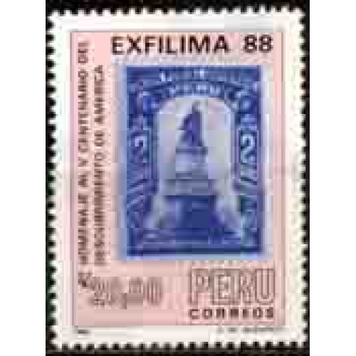 Etiquetas: PERU - Y 884 (1988) EXFILMA 88 EXPOSIÇÃO FILATÉLICA NACIONAL 500º ANIVERSÁRIO DO DESCOBRIMENTO DA AMÉRICA- REPRODUÇÃO DE SELO COM MONUMENTO A COLOMBO