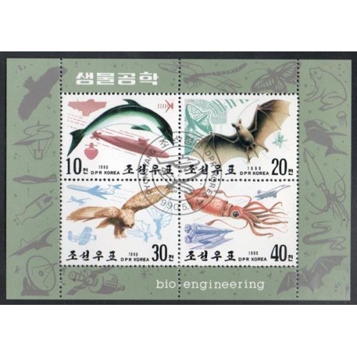 Etiquetas: CORÉIA DO NORTE - BLOCO COM 4 SELOS - CARIMBADO - FAUNA - ENGENHARIA BIOLÓGICA - 1990
