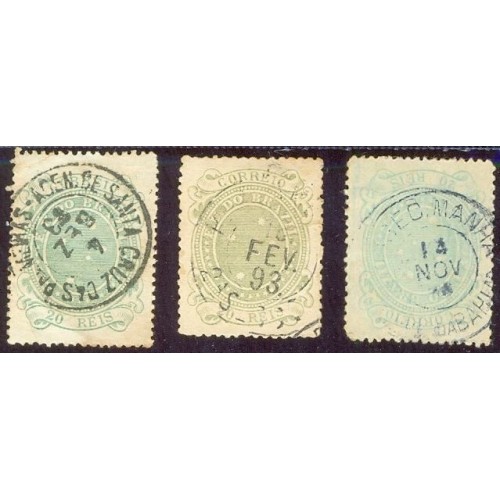 R-070ab - 1890/1894 - CONJUNTO 3 SELOS CARIMBADOS - 3 CORES - CRUZEIRO 500 RÉIS - 1 SELO CARIMBO SANTA CRUZ DOS PALMEIRAS - CHARNEIRA - PONTOS DE OXIDAÇÃO - RHM R$ 185,00 (37 UFS X R$ 5,00)