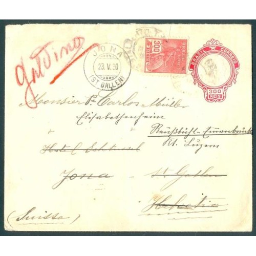 EN-76 - 1928 - ABAS MODELO II - FORMATO 129/132 X106/108MM - CARMIM - CIRCULADO DO BRASIL PARA SUÍÇA COM CARIMBO DE CHEGADA EM JONA - 23 DE MAIO DE 1930 - COM SELO ADICIONAL REGULAR DE 300 RÉIS - RHM R$ 95,00 (19 X R$ 5,00)