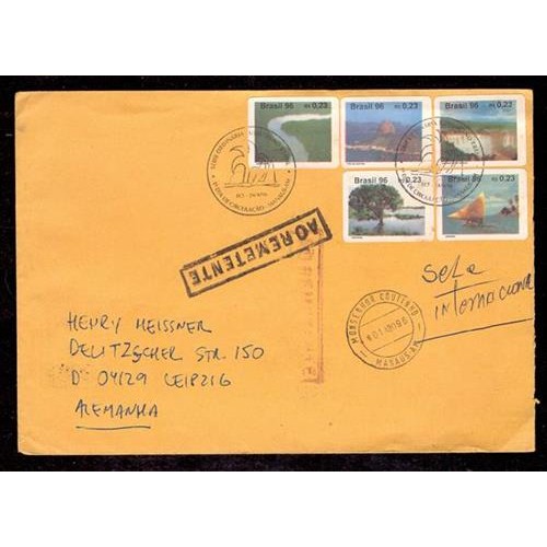ENVELOPE - CIRCULADO EM 1996 CONTENDO A SÉRIE COMPLETA REGULARES TURISMO 1 - CARIMBO CBC E CARIMBO DA AGÊNCIA MONSENHOR COUTINHO (MANAUS) DESTINO ALEMANHA E CARIMBO DEVOLVIDO AO REMETENTE E ANOTAÇÃO A CANETA DE FALTA DE SELO INTERNACIONAL