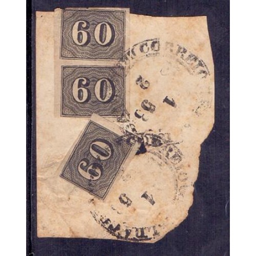 I-14 - CARIMBO CORREIO GERAL DA CORTE - 1 FEVEREIRO 1853 - 60 RÉIS - VERTICAL - SOBRE FRAGMENTO ORIGINAL PAR + SELO - PEQUENO DEFEITO SELO SUPERIOR DO PAR E FALTA UMA PEQUENA PARTE DO PAPEL AO LADO DO SELO ISOLADO - PEÇA MUITO INTERESSANTE E RARA