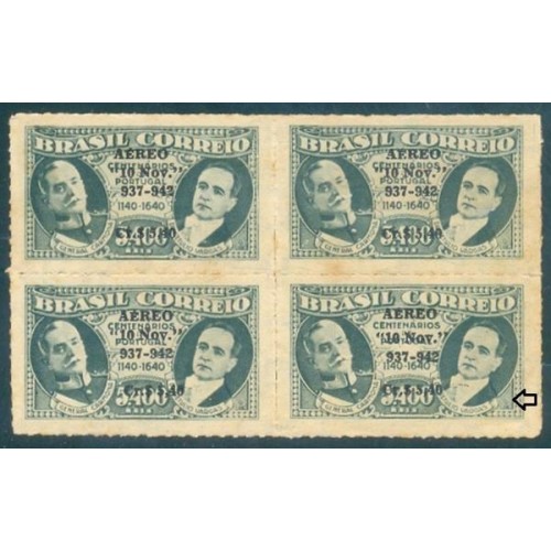 A-045/45B - 1942 - 5º ANIVERSÁRIO DO ESTADO NOVO - SELO C-0167 - C/ SOBRECARGA PRETA - PRESIDENTE CARMONA E VARGAS - QUADRA - NOVA - GOMADA - PONTOS DE OXIDAÇÃO - SELO INFERIOR DIREITO É VARIEDADE BROCHE - RHM R$ 530,00 (106 UFS X 5,00)