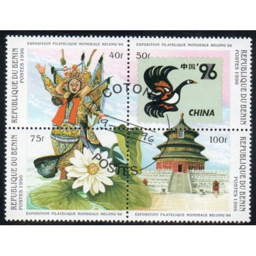 BENIN - QUADRA - CARIMBADO - ARTE - EXPOSIÇÃO FILATÉLICA MONDEL E PEQUIN - 1996