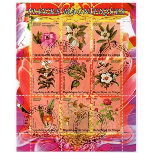 CONGO - BLOCO COM 9 SELOS - CARIMBADO - FLORA - FLORES DIVERSAS - 2007