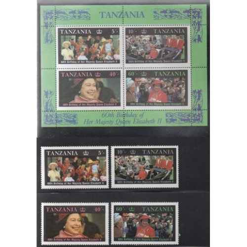 Etiquetas: TANZÂNIA - 1987 - 317/320+BL52 - SÉRIE COM 4 SELOS + BLOCO - REALEZA - ANIVERSÁRIO DA RAINHA ELIZABETH II