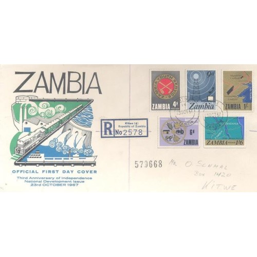Etiquetas: ZAMBIA - 1967 - FDC - 3º ANIVERSÁRIO DA INDEPENDÊNCIA - DESENVOLVIMENTO NACIONAL: SÉRIE C/ 5 SELOS C/ MAPA, ANTENA DE RÁDIO E TELEVISÃO - AGROPECUÁRIA - Y 0034/0038