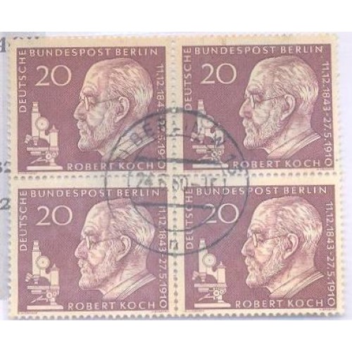 Etiquetas: ALEMANHA BERLIN - 1960 - USADO - MEDICINA - CINQUENTENÁRIO DA MORTE DO DR. ROBERT KOCH - QUADRA CIRCULADO - YT-170