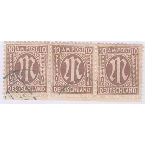 Etiquetas: ALEMANHA BIZONA - 1945-56 - USADO - MÚLTIPLO - 10p MARROM - TRINCA DE SELOS - YT-07