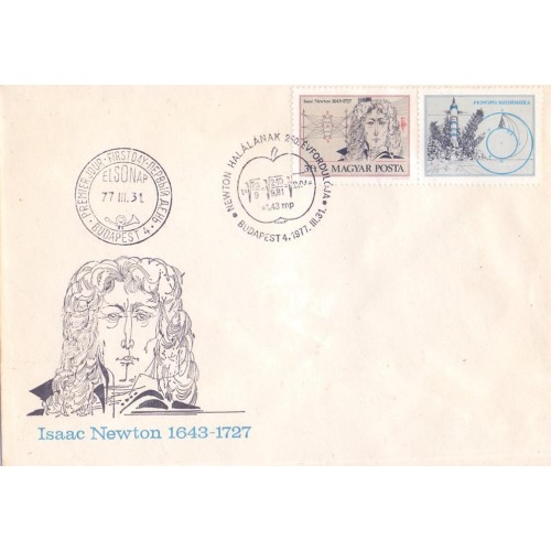 Etiquetas: HUNGRIA - 1977 - CIÊNCIA: 250º ANIVERSÁRIO DA MORTE DO FÍSICO E MATEMÁTICO ISAAC NEWTON (1643-1727) - CARICATURA - SELO VINHETA SOBRE FDC - YT-2564