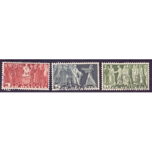 SUIÇA - 1938 - USADO - SÉRIE HISTÓRICA - CONCLUSÃO DO ACTO FEDERAL - DIETA DE STANS - SÍMBOLO DO DIREITO AO VOTO GERAL - PAPEL BRANCO C/ FIO DE SEDA AZUL E VERMELHO - SÉRIE 3 SELOS - YT-313A/315C
