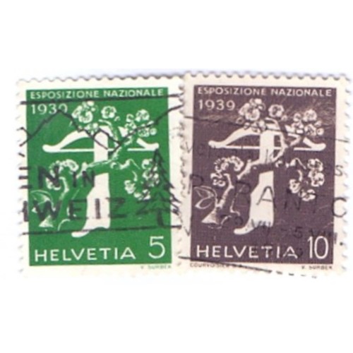 Etiquetas: SUIÇA - 1939 - USADO - ABERTURA DA EXPOSIÇÃO NACIONAL DE ZURICH 5c - 10c - C/ LEGENDA EM ITALIANO - 2 SELOS - YT-0333+335