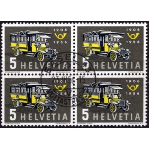 SUIÇA - Y 572 (1956) CINQUENTENÁRIO DOS AUTOS POSTAIS - QUADRA COM CARIMBO