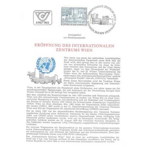 Etiquetas: ÁUSTRIA - 1979 - MINI EDITAL ARQUITETURA - INAUGURAÇÃO DO CENTRO INTERNACIONAL DAS NAÇÕES UNIDAS EM VIENA 6s VERDE VISTA DO CENTRO SOBRE MINI EDITAL C/ CARIMBO DE 1º DIA - Y 1445