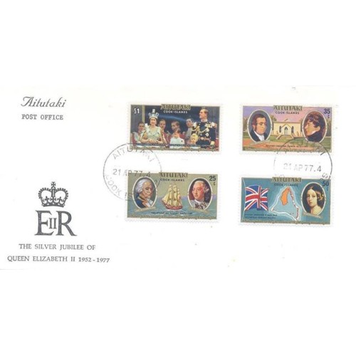 AITUTALI - 1977 - FDC - REALEZA - 25º ANIVERSÁRIO DA ASCENSÃO AO TRONO DE SUA MAJESTADE A RAINHA ELIZABETH II - SÉRIE 4 SELOS OSBRE FDC OFICIAL ILUSTRADO E BLOCO SOBRE FDC - Y 0201/204+BL-15