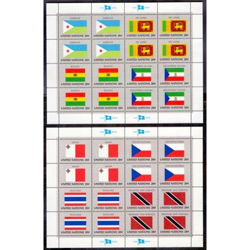 NAÇÕES UNIDAS - BANDEIRAS - 2 BLOCOS COM 16 SELOS - DJIBOUTI, SRI LANKA, BOLÍVIA, GUINÉ EQUATORIAL, MALTA, CHECOSLOVÁQUIA, TAILÂNDIA, TRINDADE E TOBAGO