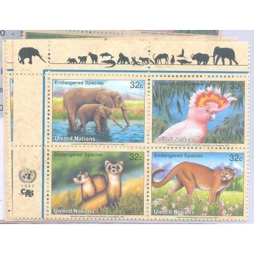 Etiquetas: ONU NEW YORK - 1997 - MINT - PROTEÇÃO DA NATUREZA - ANIMAIS EM EXTINÇÃO - ELEFANTE, CACATUA, FURÃO, PUMA - Y 720/23