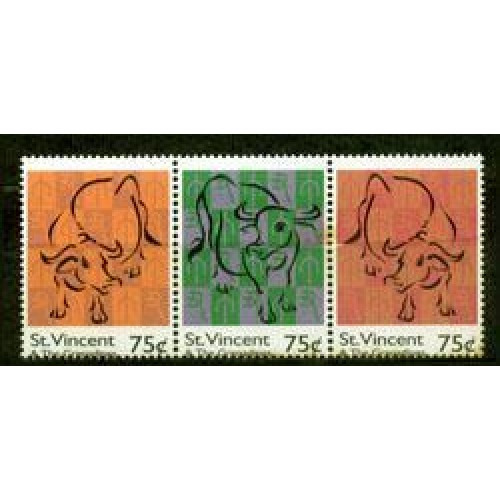 Etiquetas: ST.VICENT - Y 2994/96 (1997) - NOVO ANO CHINÊS - ANO DO BOI - SERIE 3 SELOS MINT SE-TENANT NS HORIZONTAL