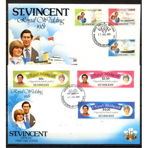 ST. VINCENT - Y 0622/627 (1981) CASAMENTO REAL DO PRÍNCIPE CHARLES E LADY DIANA - NAVIOS - SÉRIE 6 SELOS SOBRE DOIS FDC OFICIAIS ILUSTRADOS-UM DELES COM NAVIO - VALOR DA SÉRIE NO CATÁLOGO NOVA OU USADA