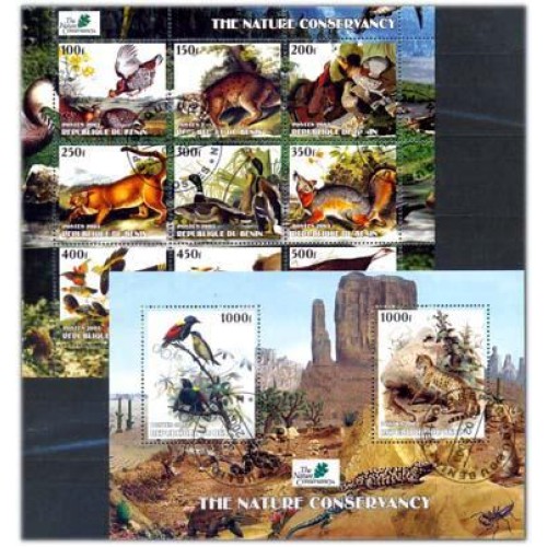 BENIN - FAUNA FELINOS E AVES - SERIE 9 SELOS USADOS EMITIDOS EM FOLHINHA E UM BLOCO USADO