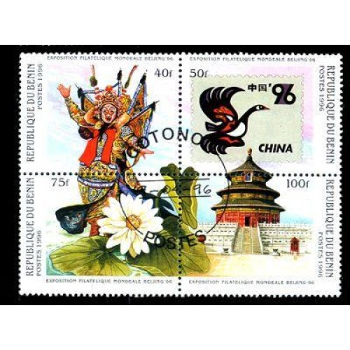 Etiquetas: BENIN - Y 710 U/710 X -ANO 1996- EXPO. FILATÉLICA MUNDIAL EM BEIJIJNG ( CHINA) PERSONAGEM CHINESES- TEMPLO -AVE -FLOR -SÉRIE 4 SELOS EMITIDOS EM QUADRA USADOS