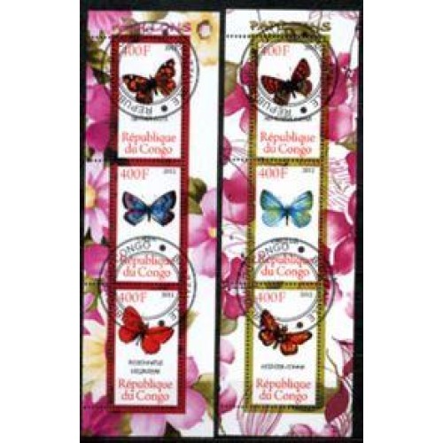 Etiquetas: CONGO - FAUNA - BORBOLETAS - 2 BLOCOS COM 3 SELOS USADOS EM CADA BLOCO
