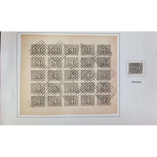 Etiquetas: I-12 - VERTICAIS (OLHO DE CABRA) - 20 RÉIS - 4ª FALSIFICAÇÃO SPIRO - FOLHA COMPLETA 25 FALSOS + SELO ORIGINAL NOVO (240 UFS)