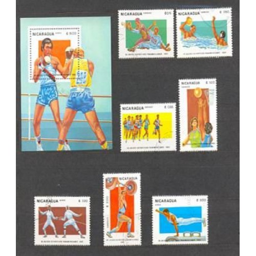 NICARÁGUA - Y 1271/75+AE +BL DO ANO 1983-IX JOGOS PANAMERICANOS : BOXE- GINÁSTICA NO CAVALO COM ALÇA -ESGRIMA- HALTROFILISMO- BASQUETE- MARATONA- POLO AQUÁTICO-BASEBALL -SÉRIE 7 SELOS E BLOCO USADOS