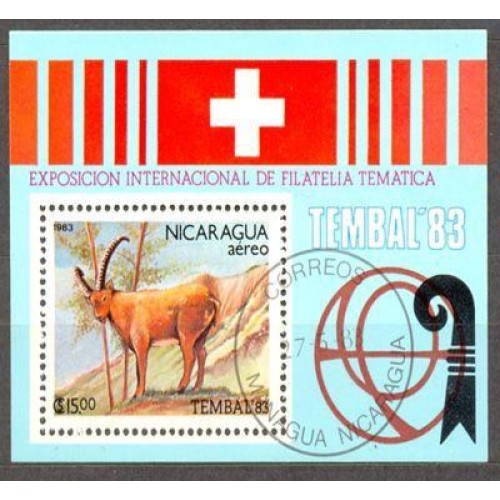 Etiquetas: NICARÁGUA - Y B 158 DO ANO 1983 - TEMBAL 83- EXPO. INTERNAICONAL DE FILATELIA TEMÁTICA NA SUIÇA - CABRITO MONTEZ- BLOCO USADO