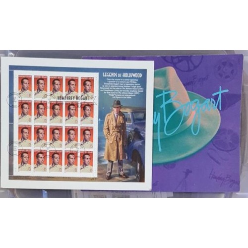 Etiquetas: ESTADOS UNIDOS - 1997 - CINEMA / ATOR HUMPREY BOGART / HOLLYWOOD - LINDA CARTELA CONTENDO MINIFOLHA 20 SELOS CARIMBOS COMEMORATIVO COLADA EM PAPELÃO