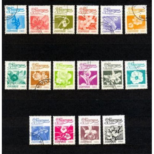NICARÁGUA - Y 1386/401 ANO 1985 - SÉRIE CORRENTE - FLORES DIVERSAS - ENTRE OUTRAS, VÁRIAS ORQUÍDEAS -SÉRIE 16 SELOS USADOS