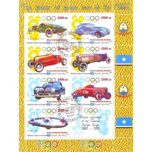 SOMÁLIA - 2010 - A HISTÓRIA DOS CARROS DE CORRIDA - BLOCO COM 8 SELOS