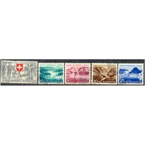Etiquetas: SUÍÇA - Y521/25 - PRÓ - PATRIA, BRASÃO E PAISAGENS 1952 - SÉRIE COM 5 SELOS USADOS - ANO 2013